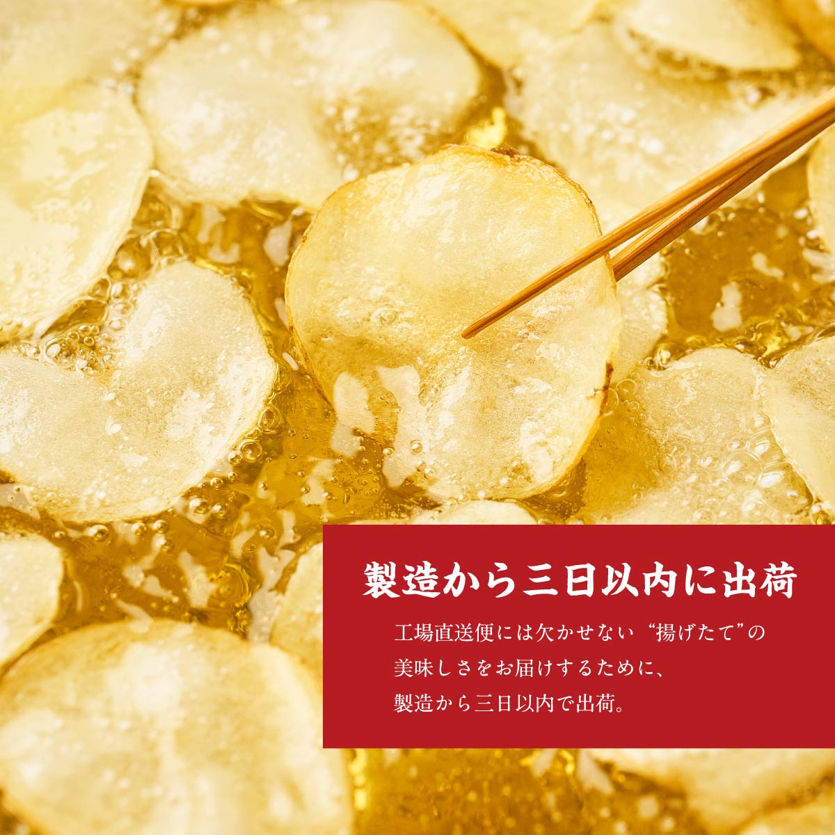 生産から三日以内に出荷し、揚げたての状態でお届けします。揚げたてだからこそ油が新鮮で、じゃがいも本来の旨みが繊細に際立つ仕上がり。工場でしか味わうことが出来なかった特別な美味しさを、ぜひご家庭でお楽しみください。 -