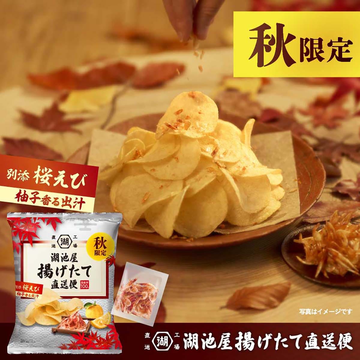 湖池屋揚げたて直送便から、秋の季節限定品が登場!秋の夜長、「柚子香る出汁」のポテトチップスに、別添の「桜えび」を振りかけて、お酒など一緒にお楽しみください。
