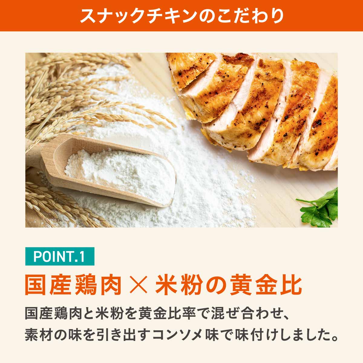 国産鶏肉と米粉を黄金比率で混ぜ合わせ、素材の味を引き出すコンソメ味で味付けしました。