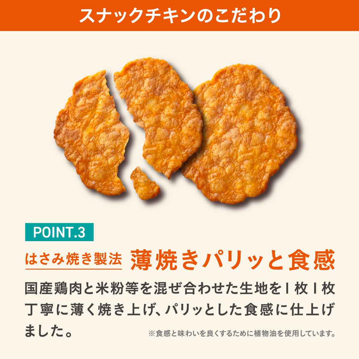 国産鶏肉と米粉等を混ぜ合わせた生地を1枚1枚丁寧に薄く焼き上げ、パリッとした食感に仕上げました。