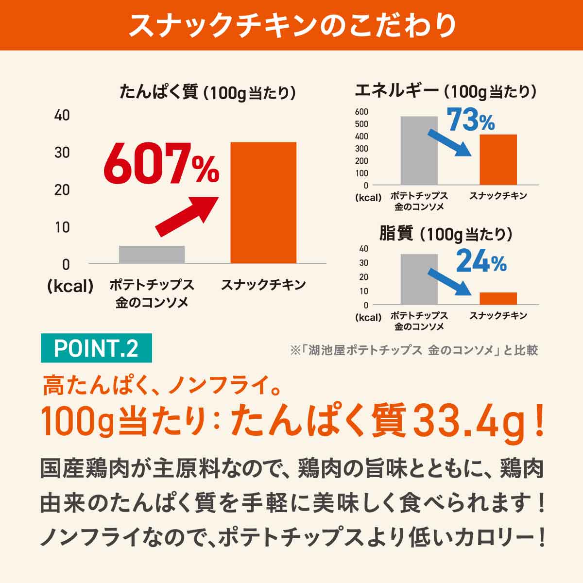 国産鶏肉が主原料なので、鶏肉の旨味とともに、鶏肉由来のたんぱく質を手軽に美味しく食べられます!ノンフライなので、ポテトチップスより低いカロリー!