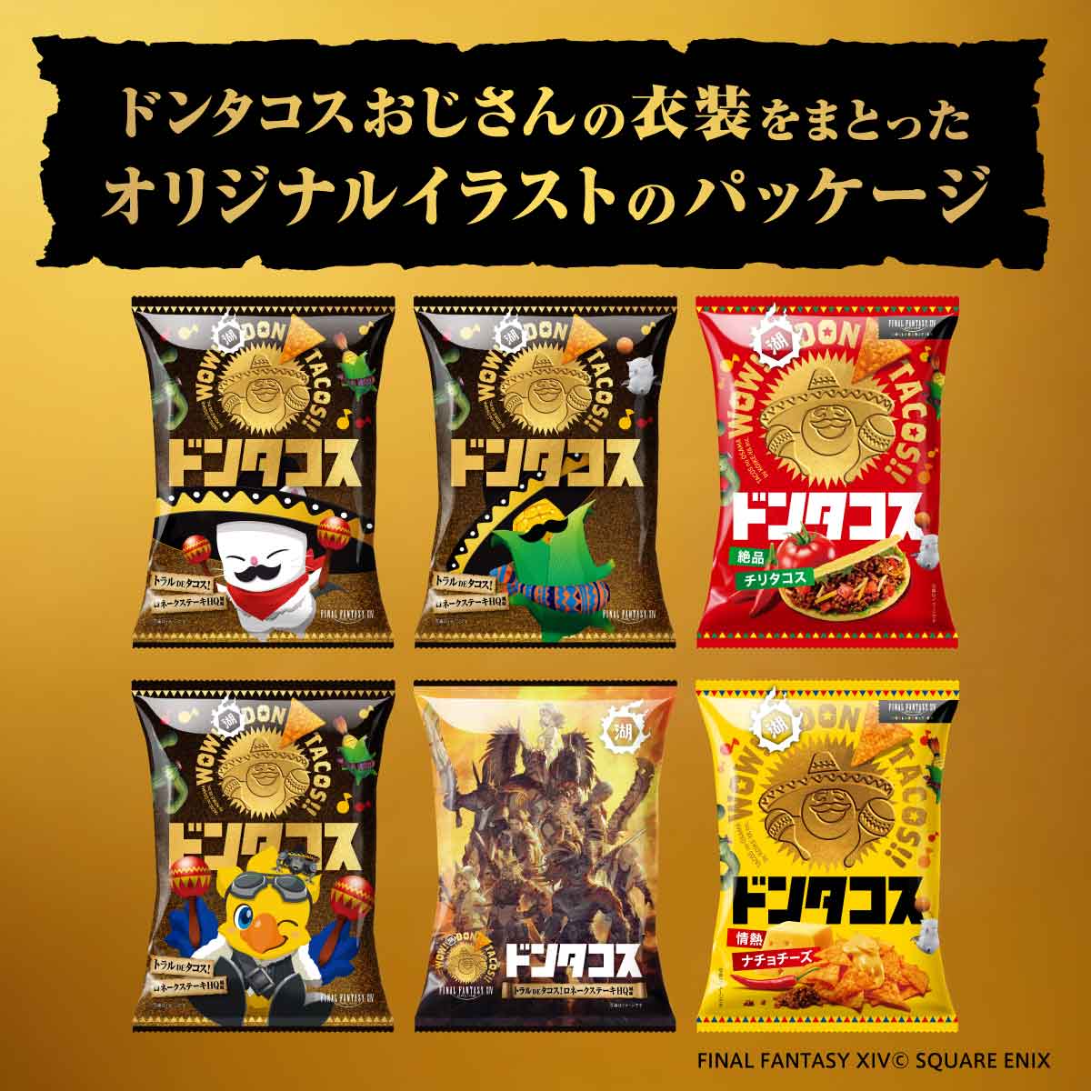 最新拡張パッケージ「黄金のレガシー」の世界観をイメージした特別なドンタコスのセットが誕生しました。 オリジナルのフレーバー「ドンタコス× ファイナルファンタジーXIV トラルDE タコス!ロネークステーキHQ 風味」は、ドンタコスのブランドキャラクターである「ドンタコスおじさん」の衣装に身を包んだオリジナルイラストやアートワークなどが入ったパッケージデザイン。 味も「トラル大陸で愛されるタコスの味わい」をイメージした、スパイスをきかせたステーキ風味に仕上げました。