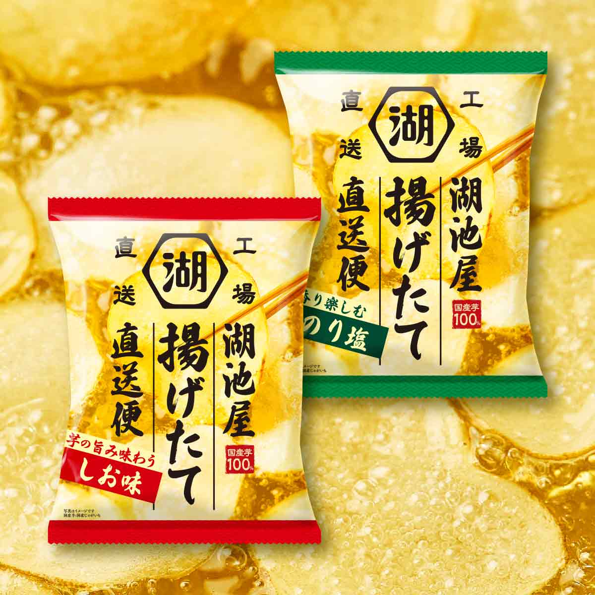 工場でしか味わえない揚げたての美味しさをお届けしたい。そんな想いから誕生した「湖池屋揚げたて直送便」。「芋の旨み味わう しお味」と「香り楽しむ のり塩」が楽しめる、お得な味くらべセット。