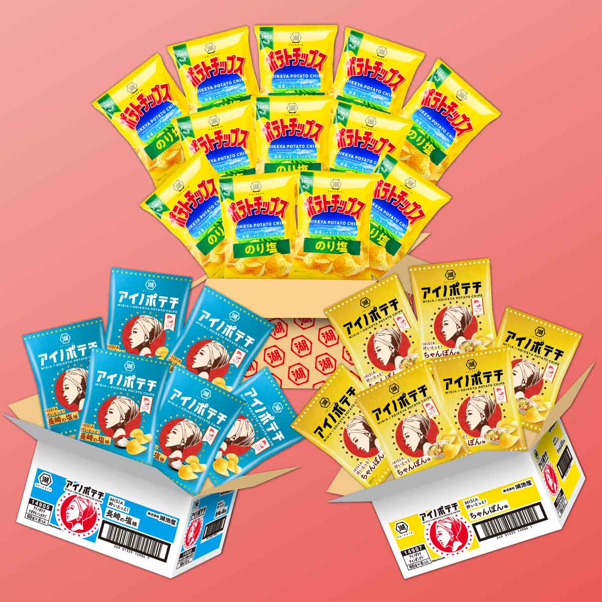 • 湖池屋のポテトチップスやスナックをたっぷり詰め込んだ、当店オリジナルのアソートをご用意しました。