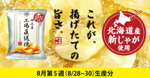 「湖池屋工場直送便」とは、 生産3日以内に出荷を行う【揚げたてポテチ】です! 油の鮮度がバツグンなので、 その香り・旨みはまさに格別!(≧▽≦)。・*:★ そして、いよいよ!!! 北海道産の新じゃがシーズンがやってきました…!!! 今回の「湖池屋工場直送便」(8月第5週(8/28~30)生産分)はなんと…!! \\北海道産の新じゃがを100%使用いたします// ヽ(≧∇≦)人(≧∇≦)人(≧∇≦)ノ 新じゃがの工場直送便は、人気のあまりすぐに完売する可能性がございます(^_^;)! お求めの方はお急ぎくださいね!!ヾ(*゜○゜)ノ★