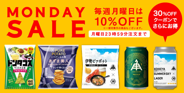 ※注文画面のクーポン利用欄に上記のクーポンコードをご入力ください ※クーポンコードの使い方は こちら ※クラフトビール「湖池屋サマースカイラガー」はマンデーセールの対象商品です。 ※クーポンの有効期限は【2023年12月31日(日)】までとなります。