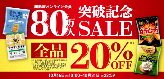 ※湖池屋オンライン会員80万人突破記念セールは10/31(火) 23:59までとなります。