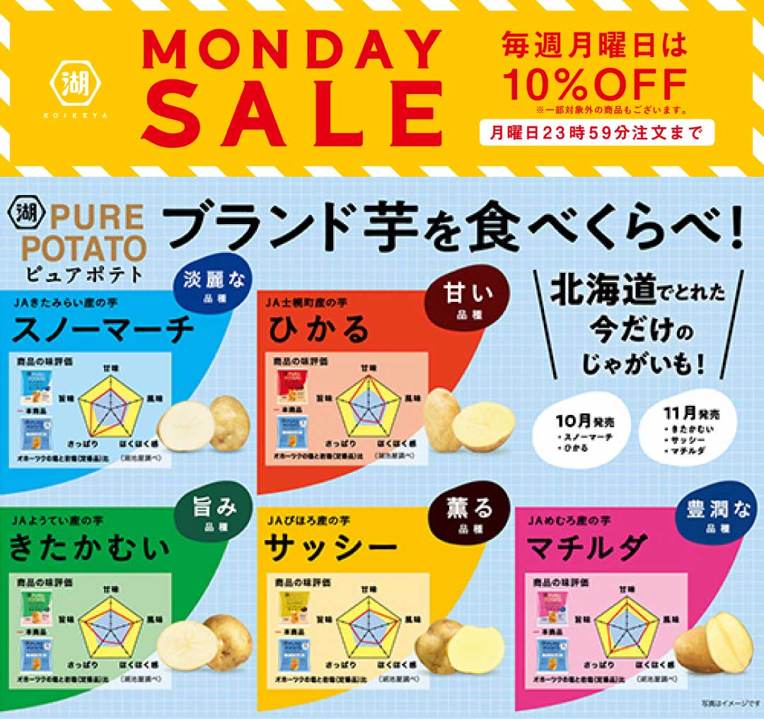 ※「工場直送便」、「ポテトチップス 今金男しゃく」など一部オンライン限定商品はマンデーセール対象外です。