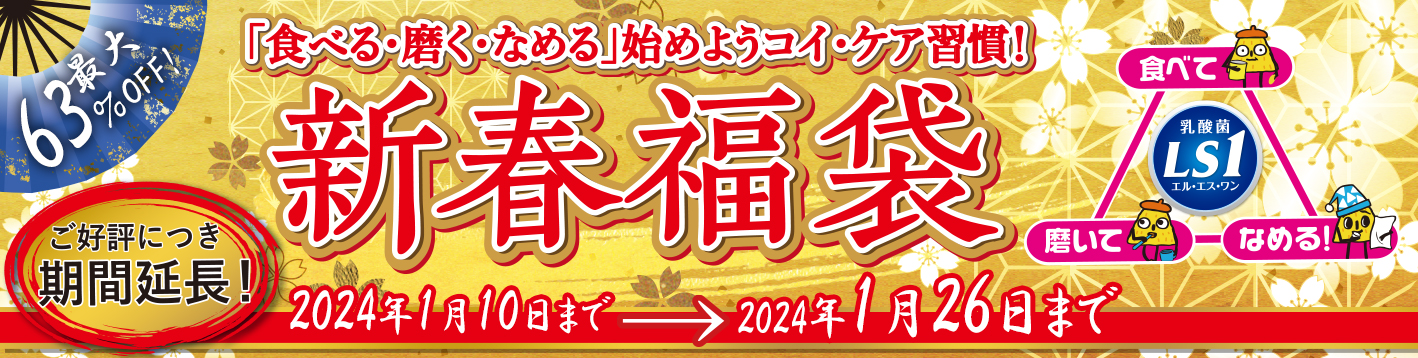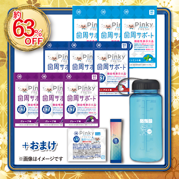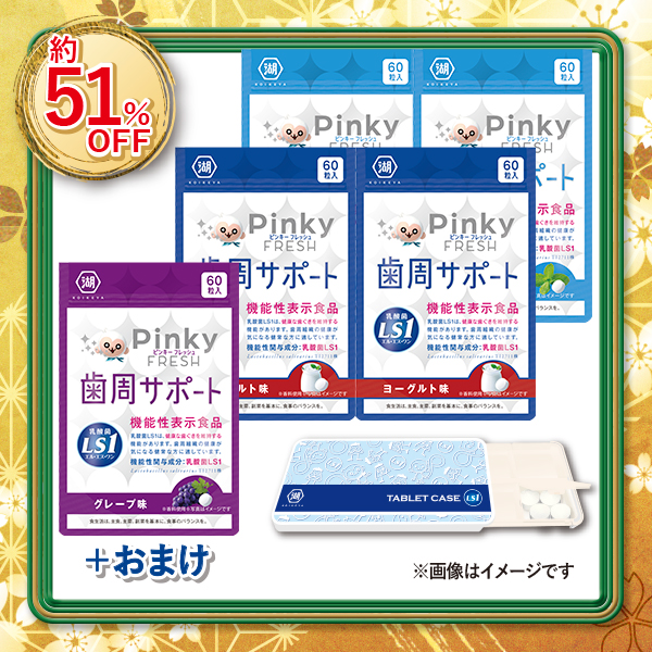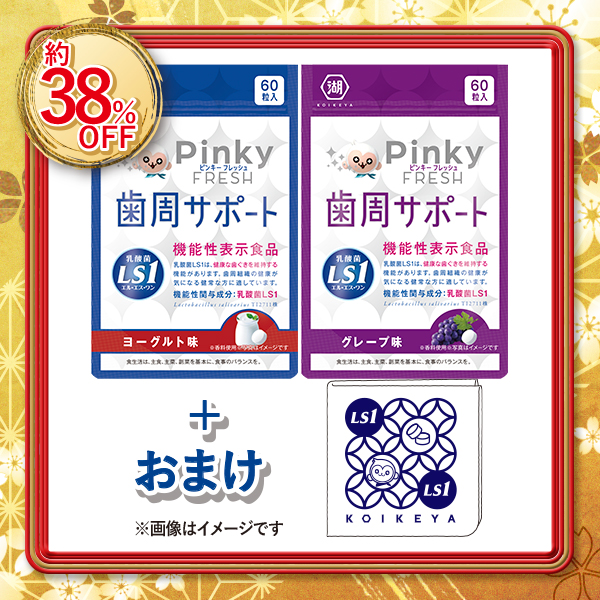 湖池屋グループ「湖池屋ヘルスケアショップ」のご紹介! 【最大63%OFF】新春福袋セールが1月26日(金)まで開催中! ![]() 湖池屋グループの「湖池屋ヘルスケアショップ」では、 2024年新春福袋セールを【1月26日(金)】まで開催中です! 寝る前の1粒で翌朝スッキリ!の乳酸菌LS1タブレットが なんと【最大64%OFF】!! 乾燥する季節のお口ケアや、非常時のお口ケア対策の備えに 是非、皆さまの日常に「お口で活きる乳酸菌」を 取り入れませんか?(*’ω’*) 福袋セール対象商品はこちら \\63%OFF!// 一番お得なまとめ買い! 福袋Aコース ![]() 「ピンキーフレッシュ LS1」全3種類×3袋と、 アルミブランケットやLEDハンディライトなど 防災対策にぴったりなアイテムを詰め込んだ 「オリジナルエマージェンシーボトル」が入ったお得なセット \\51%OFF!// 福袋Bコース ![]() 「ピンキーフレッシュ LS1」全3種類(クリーンミント・ヨーグルト:各2袋、グレープ味:1袋)と 持ち運びに便利なオリジナルピルケースが入ったセット \\38%OFF!// 福袋Cコース ![]() 「ピンキーフレッシュ LS1」ヨーグルト味とグレープ味各1袋と オリジナルハンカチが入ったセット <セール会場はこちら> ※湖池屋ヘルスケアショップへ遷移します。 ※「湖池屋ヘルスケアショップ」は別サイトとなり新たに会員登録が必要になります。 ※「湖池屋オンラインショップ」の商品とは合わせ買いができません。 ※ご不明点やご質問はお気軽に湖池屋ヘルスケアショップまでお電話ください。