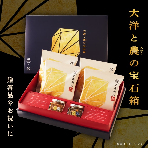 ※「大洋と農の宝石箱」は配送の都合上、他の商品との合わせ買いはできません。 ※珍味「大洋の宝石 三種昆布のめんたいまぶし」「大洋の宝石 函館生イカの北海漬け」の賞味期限は発送日を含めて14日となります。(冷蔵保存)